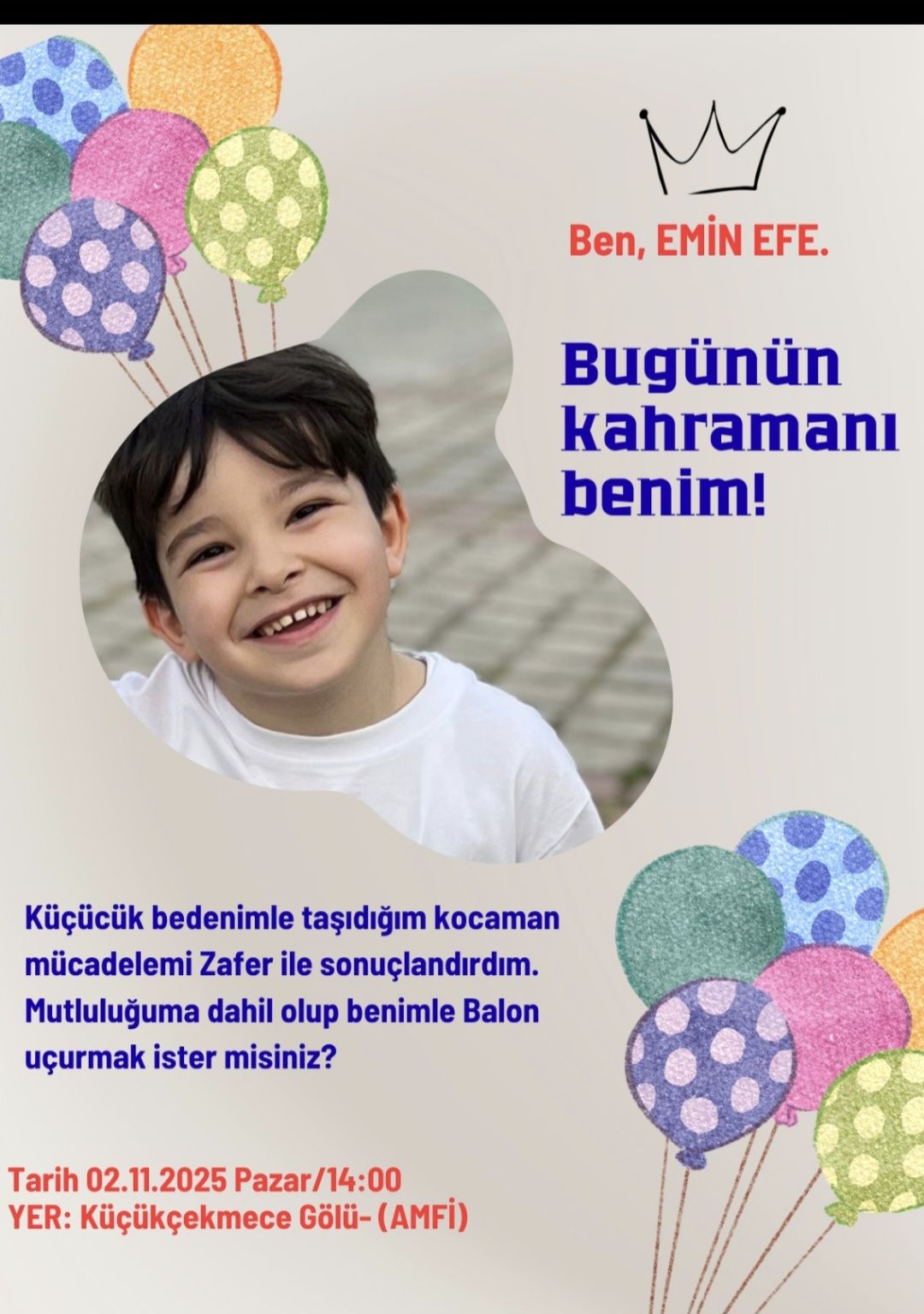 2 Kasım 2025 Pazar günü saat 14.00’te Küçükçekmece Gölü Amfi Alanı’nda, Emin Efe’nin mutluluğuna ortak olmak ve lösemiyle mücadele eden tüm çocuklara moral vermek için siz de orada olun.