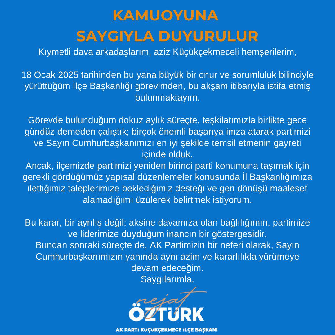 18 Ocak 2025 tarihinden bu yana büyük bir onur ve sorumluluk bilinciyle yürüttüğüm İlçe Başkanlığı görevimden, bu akşam itibarıyla istifa etmiş bulunmaktayım.