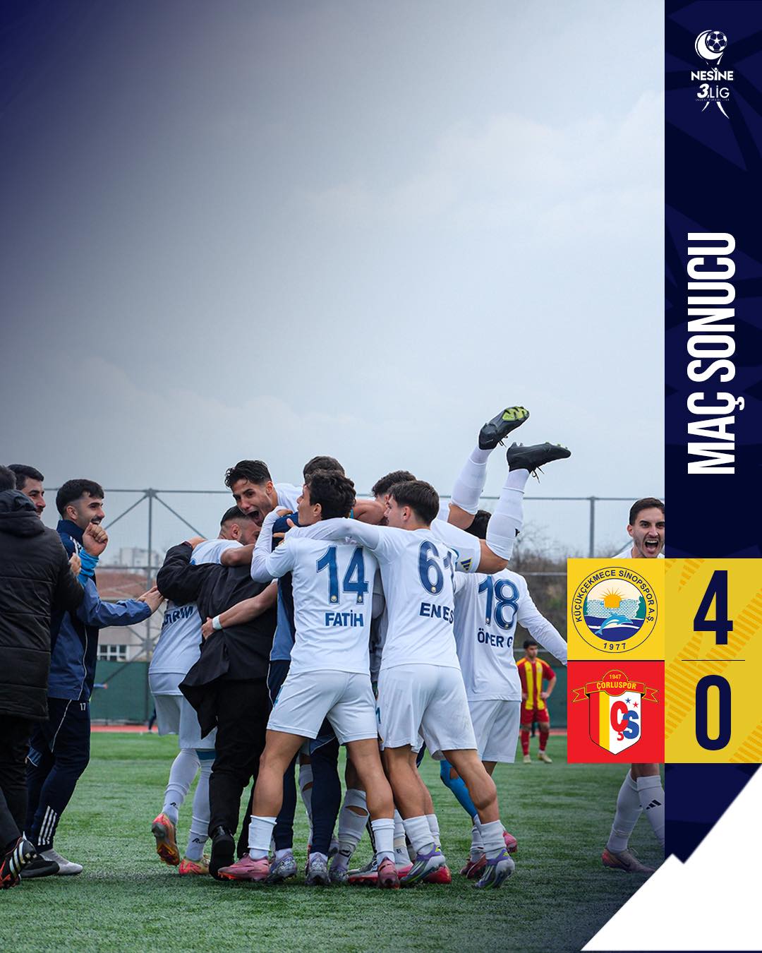 Nesine 3. Lig mücadelesinde sahasında Çorluspor 1947’yi konuk eden Küçükçekmece Sinopspor, sergilediği etkili futbol ve yüksek tempo ile rakibini 4-0 mağlup ederek haftayı 3 puanla kapattı. Baştan sona üstün bir oyun ortaya koyan kırmızı-lacivertli ekip, aldığı bu galibiyetle hem puan tablosunda önemli bir avantaj elde etti hem de taraftarına futbol ziyafeti sundu.