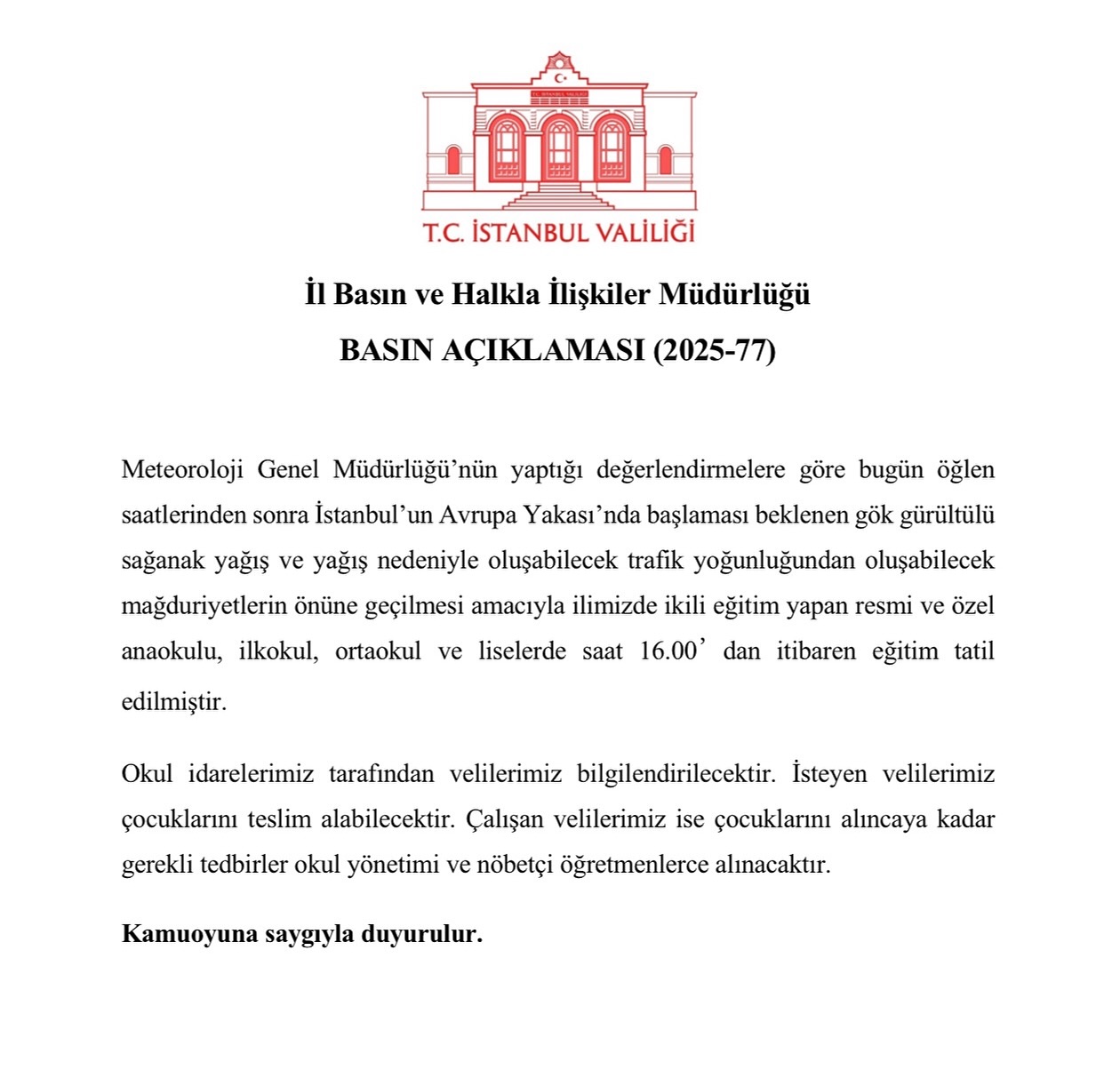 “Meteoroloji Genel Müdürlüğü’nden alınan verilere göre, 24 Ekim 2025 Cuma günü öğle saatlerinden itibaren İstanbul’un Avrupa Yakası genelinde yerel olarak kuvvetli ve gök gürültülü sağanak yağış beklenmektedir. Yağışların özellikle akşam saatlerinde etkisini artırması, şehir genelinde trafik yoğunluğu ve ulaşımda aksamalar meydana getirmesi öngörülmektedir. Bu kapsamda, öğrencilerimizin ve velilerimizin olumsuz hava koşullarından etkilenmemesi amacıyla, ikili eğitim yapan resmi ve özel anaokulu, ilkokul, ortaokul ve liselerde eğitim öğretime saat 16.00 itibarıyla ara verilmiştir.”