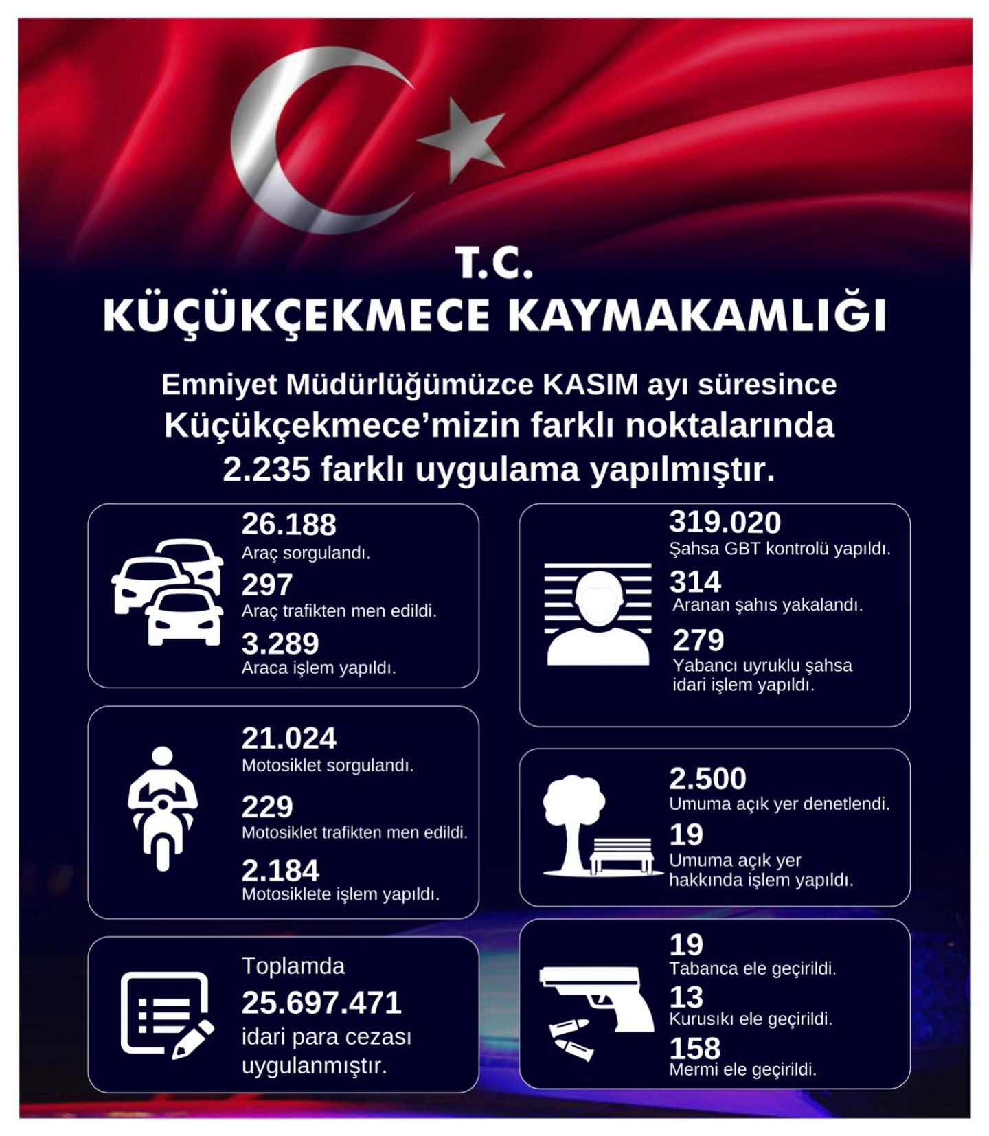 Kasım ayı boyunca toplam 25.697.471 TL idari para cezası uygulanırken, suç unsurlarına yönelik çalışmalarda 19 tabanca, 13 kurusıkı silah ve 158 mermi ele geçirildi.
