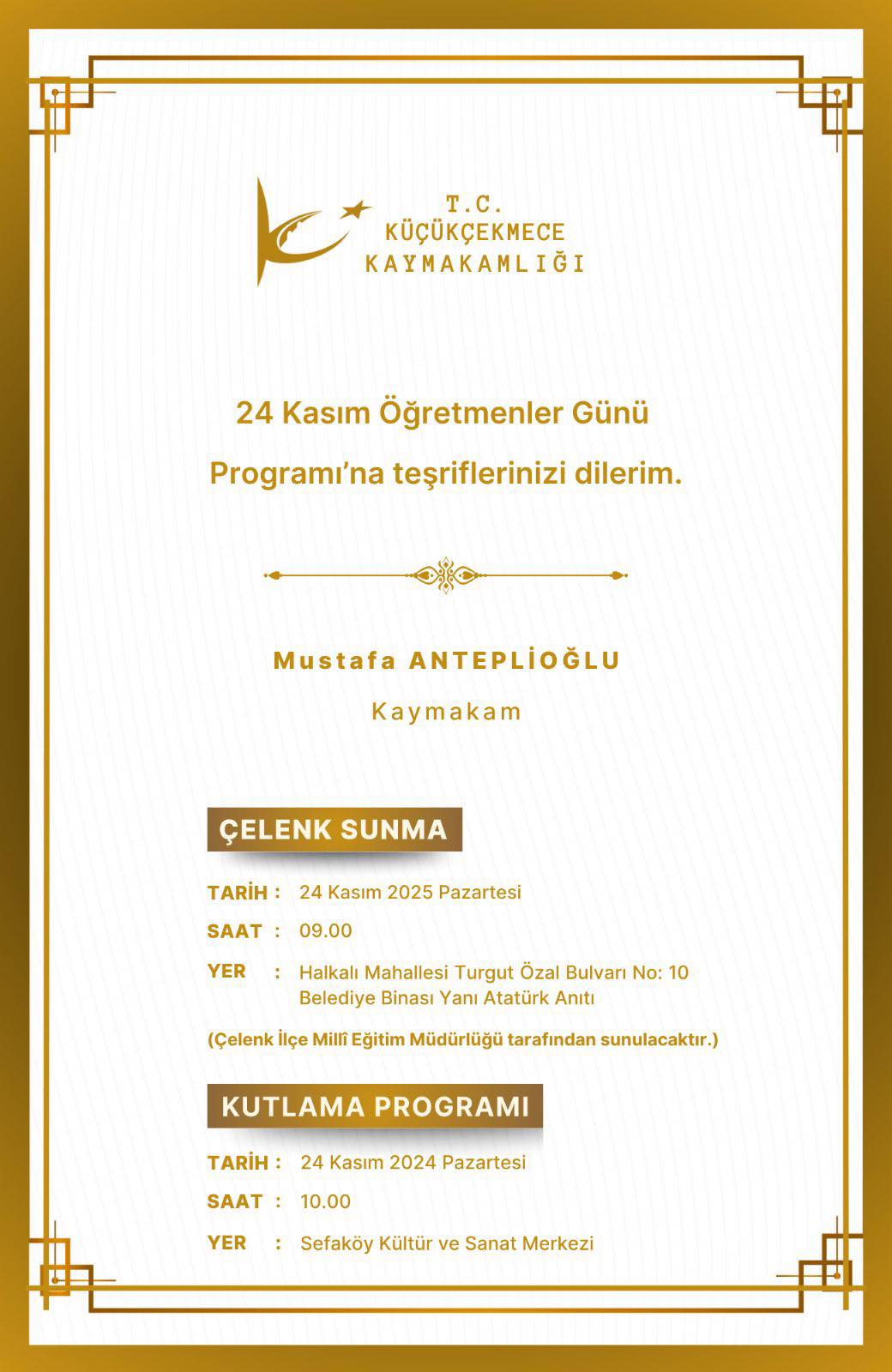 “24 Kasım Öğretmenler Günü programımıza teşriflerinizi dilerim.”