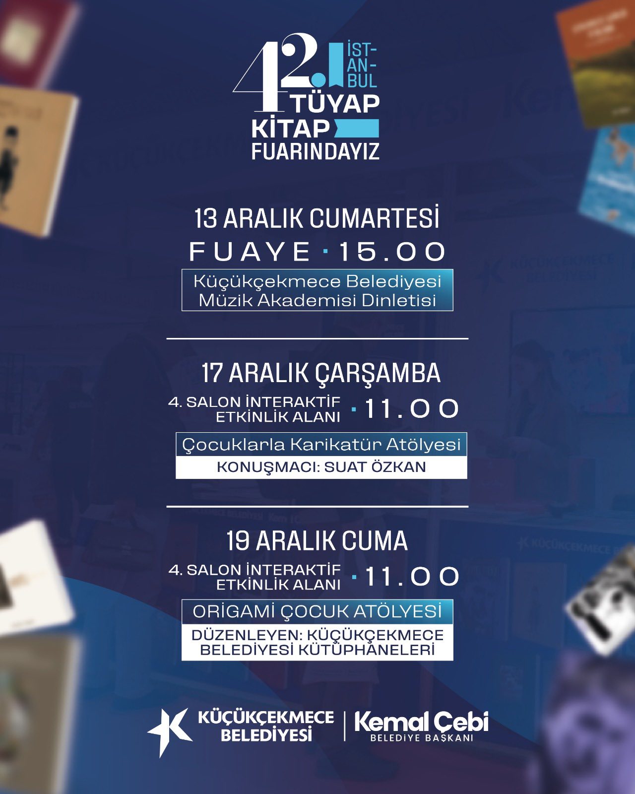 Türkiye’nin en büyük kültür ve edebiyat buluşmalarından biri olan 42. İstanbul TÜYAP Kitap Fuarı, bu yıl da binlerce kitapseveri ağırlamaya hazırlanırken, Küçükçekmece Belediyesi fuardaki yerini aldı. Küçükçekmece Belediyesi, 13–21 Aralık tarihleri arasında TÜYAP Fuar ve Kongre Merkezi’nde düzenlenen organizasyonda, 4. Salon 448 numaralı stantta ziyaretçilerini karşılıyor.
